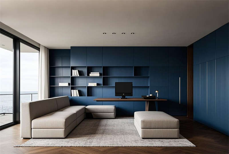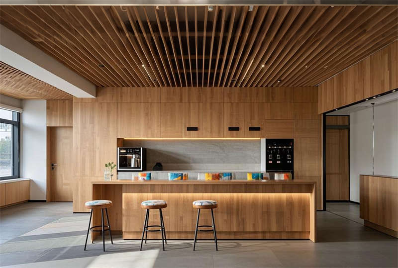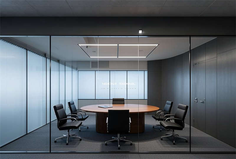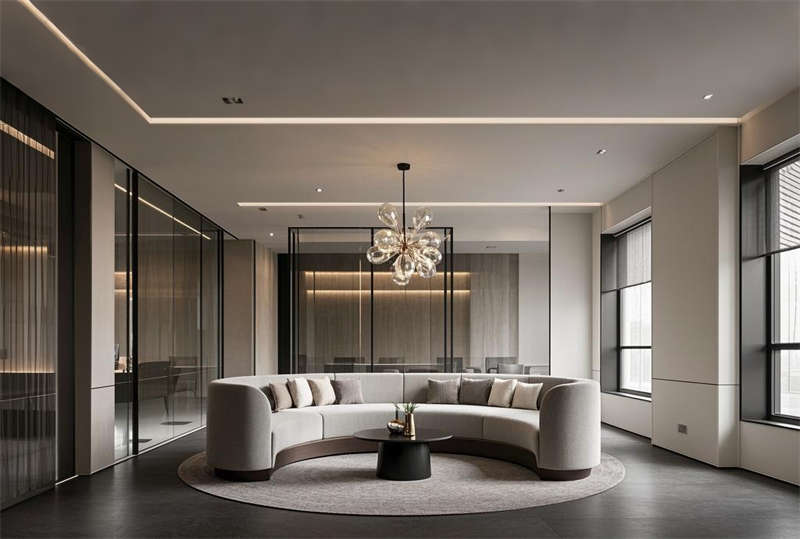 本方案采用現(xiàn)代簡約設計語言,整體空間以淺灰、白、原木三色為主基調(diào)。前臺區(qū)設置懸浮式接待臺與發(fā)光LOGO墻,搭配LED線性照明塑造企業(yè)形象。開放式辦公區(qū)采用模塊化工位布局,通過玻璃隔斷劃分功能區(qū)域,保證自然采光最大化的同時提升空間通透感。智能會議系統(tǒng)集成于各會議室,配備電動投影和書寫玻璃墻。經(jīng)理室采用深藍色烤漆木飾面提升商務質(zhì)感,休息區(qū)設置咖啡吧與卡座強化員工關懷。走廊運用導視燈帶串聯(lián)各區(qū)域,茶水間六角地磚增添趣味性。培訓室階梯式布局配合吸音墻面確保聲學效果,電話間磨砂玻璃立方體兼顧隱私與采光。VIP室智能霧化玻璃實現(xiàn)空間靈活轉(zhuǎn)換,整體設計注重功能分區(qū)與人文關懷的平衡。