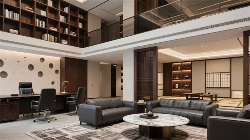 高管辦公區(qū)通過灰玻與豎向木紋鋁材構(gòu)筑半私密空間,L型胡桃木辦公桌與深棕真皮座椅彰顯商務(wù)質(zhì)感,獨(dú)立閱讀角的落地?zé)魻I(yíng)造人文氛圍。總裁辦公室運(yùn)用懸浮式書架墻與黑檀木辦公桌塑造權(quán)威感,環(huán)形皮革沙發(fā)組與天然大理石茶幾構(gòu)成高端會(huì)客場(chǎng)景,日式茶室通過木格柵與洞石墻面實(shí)現(xiàn)東西方美學(xué)交融。