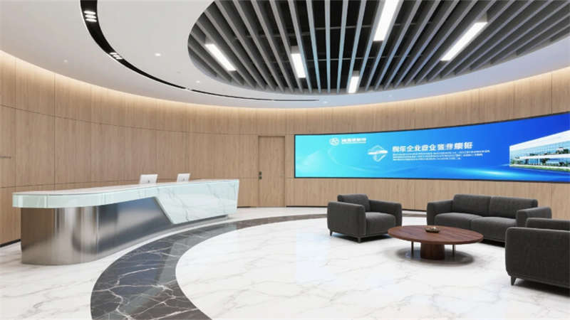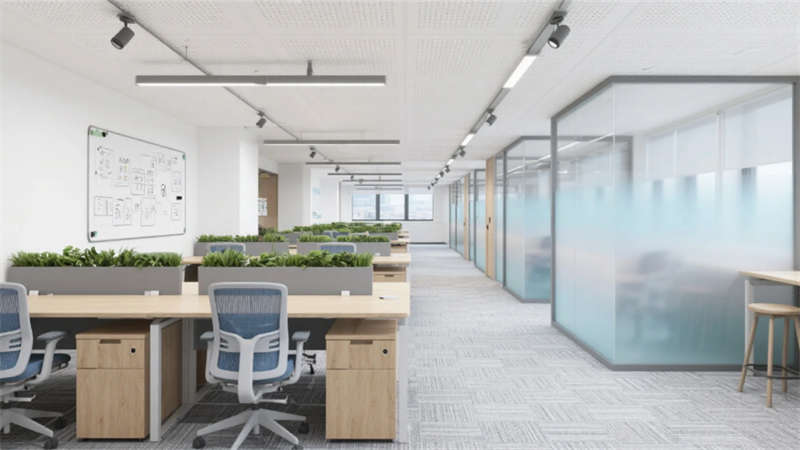 企業(yè)大堂延續(xù)外立面色系,雪花白大理石地面與深灰導(dǎo)視帶構(gòu)建空間骨架,曲面木紋石背景墻通過背光企業(yè)標(biāo)識(shí)形成視覺焦點(diǎn),漸變鋁方通吊頂?shù)木€性光帶引導(dǎo)人流走向。開放式辦公區(qū)以灰橡木辦公模塊為核心,沖孔鋁板吊頂整合軌道射燈系統(tǒng),漸變霧化玻璃隔斷內(nèi)置綠植槽,編織紋地毯有效降低行走噪音。