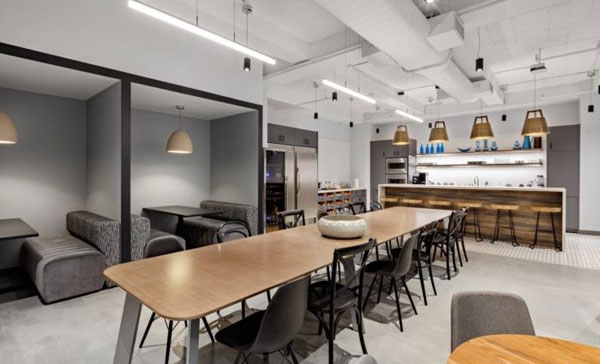 大型咖啡館和食品儲藏室是為協(xié)作而設(shè)計的,是辦公室的公共中心。一張長長的餐桌、展位、座位和休息區(qū)為非正式會議、社交聚會的地方。