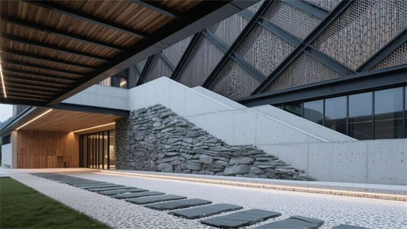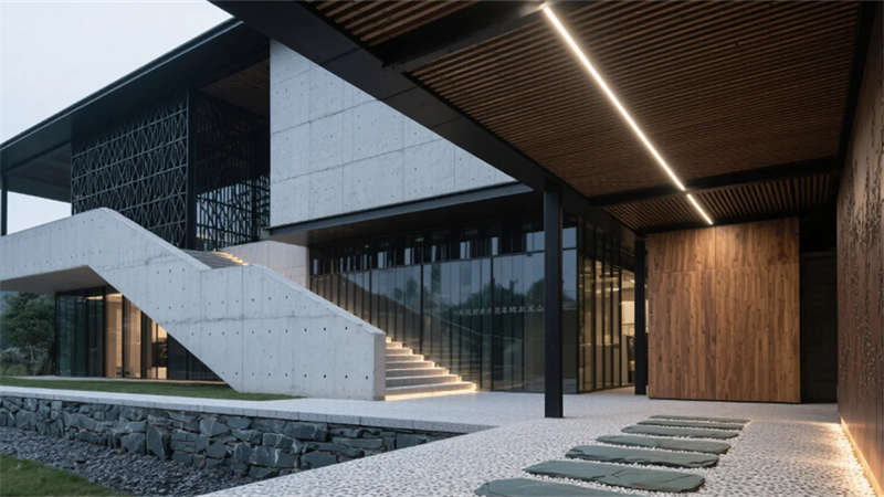 建筑外觀以滁州竹海為靈感,斜交網(wǎng)格結(jié)構(gòu)勾勒出山勢(shì)輪廓,穿孔鋁板在光影間呼吸。懸浮橡木雨棚如云中棧橋,將自然意象引入現(xiàn)代語(yǔ)境。青石板基座延伸至室內(nèi),形成連貫的在地?cái)⑹隆?/p>