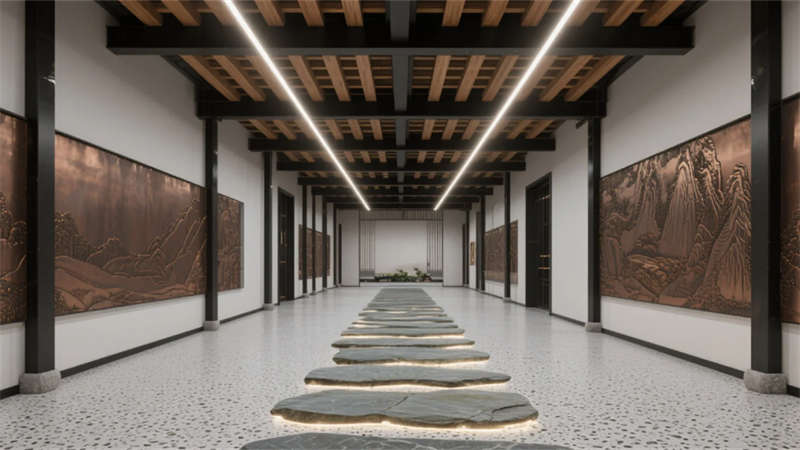前臺(tái)大廳成為文化凝練的序章:層疊銅藝山形墻在光暈中起伏,夯土臺(tái)面與懸浮木構(gòu)的碰撞隱喻傳統(tǒng)與未來(lái)的對(duì)話。紙膜藝術(shù)燈如空中浮云,柔化工業(yè)風(fēng)的冷峻基調(diào)。