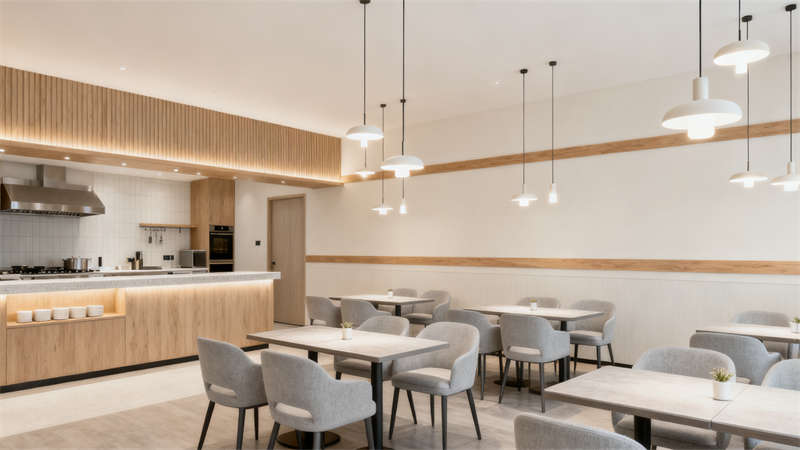 餐廳區(qū)域設(shè)計(jì)簡潔而富有質(zhì)感,燈光設(shè)計(jì)巧妙,既保證了充足的照明,又營造出溫馨的用餐氛圍,桌椅擺放合理,留出足夠的活動空間,讓住客能在舒適的環(huán)境中享受美食。?