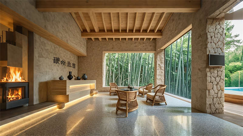 某江淮水岸民宿以“水系文明”為線(xiàn)索,入口設(shè)置霧幕投影再現(xiàn)淝河古渡,走廊地面鑲嵌歷代治水銘文玻璃磚,頂層露臺(tái)通過(guò)光影秀演繹巢湖流域生態(tài)變遷,形成沉浸式文化長(zhǎng)廊。