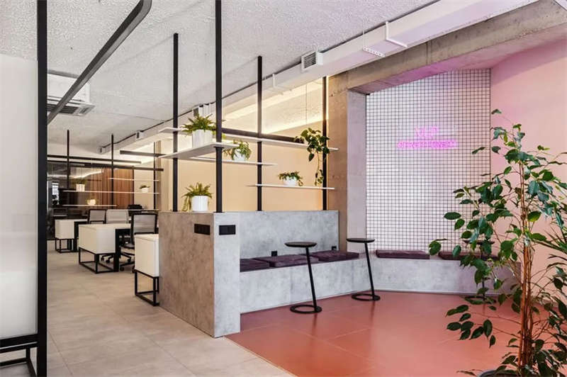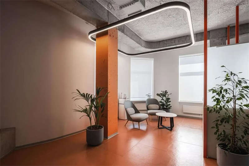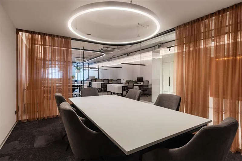 一種是沿辦公室周邊設(shè)置了一圈燈帶,燈光從白色天花板上反射出來(lái),散發(fā)出令人賞心悅目的溫暖漫射光。還有一種線性照明形式呼應(yīng)流線型的建筑輪廓,將整個(gè)辦公室從入口區(qū)域連接到行政工作區(qū)。另一個(gè)這樣的設(shè)計(jì)元素出現(xiàn)在廚房區(qū),當(dāng)陰天自然光不足時(shí)可以照亮這里的空間。此外,每組工位都有一個(gè)獨(dú)立光源,如有必要,每個(gè)員工都可以自行打開或關(guān)閉。