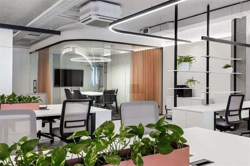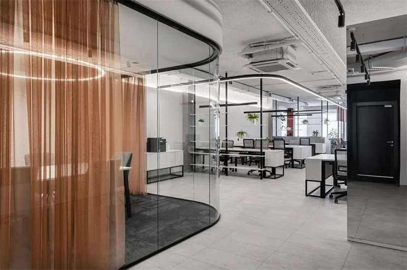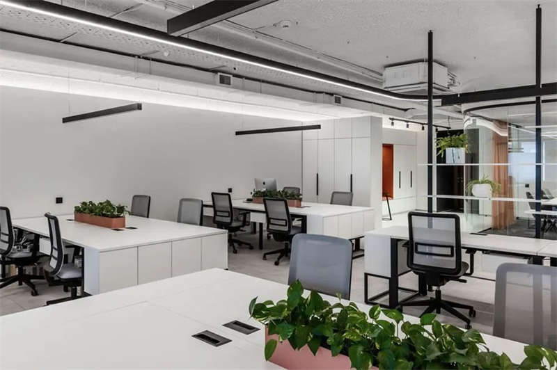 淺灰色的頂面與地面,配以白色墻體和主體辦公家具,再輔以縝密的燈光照明,讓室內(nèi)呈現(xiàn)明亮純凈的光彩質(zhì)感;黑色線性元素的加入豐富了空間構(gòu)成和視覺(jué)趣味性;唯一的暖棕色彩的點(diǎn)綴讓空間更靈動(dòng)更富有層次感,也為純凈極簡(jiǎn)的空間帶去一抹溫暖氣息。