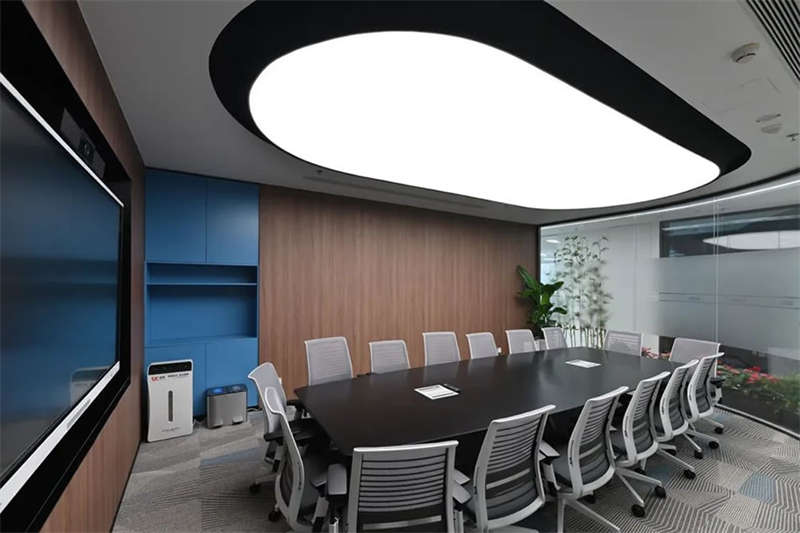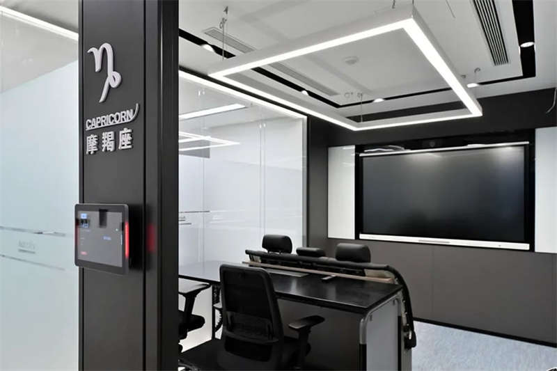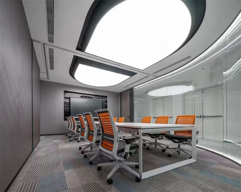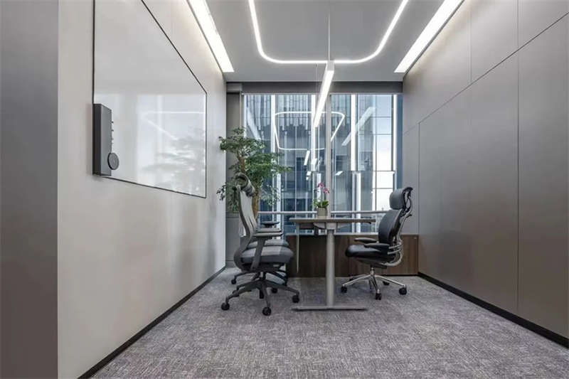 在接待前廳左右兩邊各設(shè)置了一個大會議室,其中一個是現(xiàn)代酷灰的可二合一的會議室,另一個是穩(wěn)重優(yōu)雅的行政會議室。感謝成品隔斷供應(yīng)商卡萊斯卓的緊密配合和支持,在設(shè)計(jì)師的要求下,把LED燈帶嵌入了雙層玻璃隔斷中。讓整個會議室區(qū)域看上去充滿科技感!