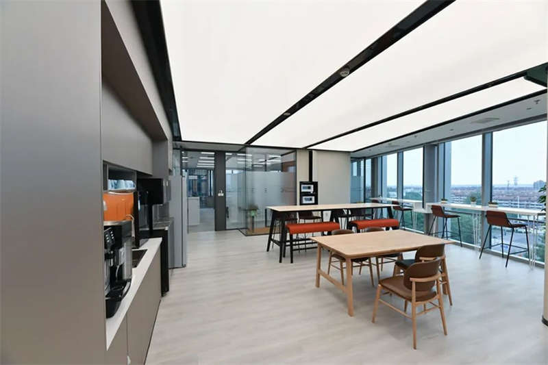員工區(qū)部份選用了電動可調(diào)的升降辦公桌,以滿足員工個性化的需求,白灰色的家具搭配,混搭淺木色的休閑洽談區(qū)域,地面選用流線款長版的無膠水鋪裝的地毯相呼應(yīng)。提升了空間品質(zhì)和美感。
