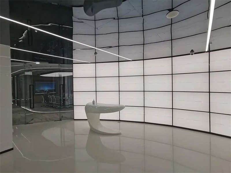 在電梯出來,一步入半圓弧的接待前廳,馬上看到的是以安全氣囊元素為主創(chuàng)意的,帶燈光變化的半弧造型墻,時(shí)尚大氣。在這純粹的黑白灰空間里,一個純白色飛馳動感造型的前臺安安靜靜的擺設(shè)在那,在不使用的時(shí)候,它也是一個時(shí)尚的藝術(shù)品。和背鏡墻相結(jié)合,體現(xiàn)了速度與安全的設(shè)計(jì)理念。