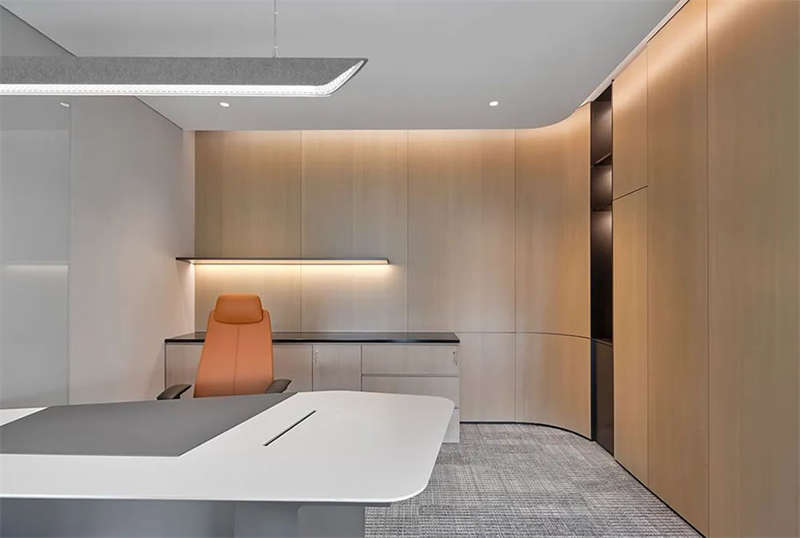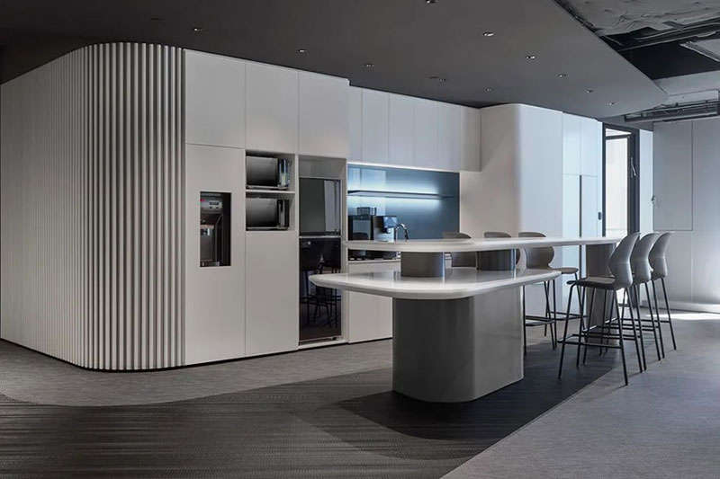 由于建筑不是專業(yè)寫字樓,全開放的租賃面積、過大的柱體、凌亂的工業(yè)管道天花也給設計提出了難題。為了平衡好行政辦公和會客及不同部門之間的功能分區(qū),設計師把打印、咖啡、小洽談休憩空間作為功能島置入整層的正中,合理分隔東西兩個工區(qū)并方便大家便捷使用。沿窗的柱體通過裝飾面的包裹和扭轉(zhuǎn)形成空間亮點,輔以休閑家具,簡短的洽談分享、小的會議討論在此得以解決,員工在介于室內(nèi)空間和自然窗光中獲得了獨特的體驗和助益。