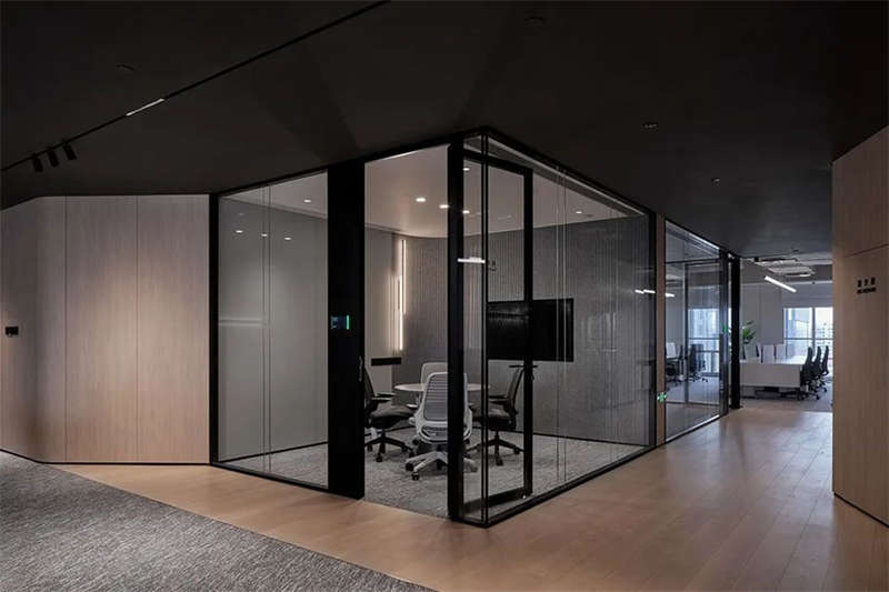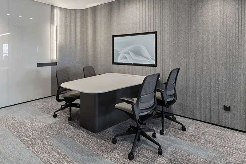 進入會議空間,設計師刻意控制它的視覺張力,前區(qū)的體驗得以延續(xù),灰黑色調(diào)覆蓋目力所及并引入更多的柔性材料,專業(yè)、專注是會議空間的功能立本但也不乏我們對活力元素的照拂,每一個會議室我們都選擇了形式各樣的藍色地毯來裝點。