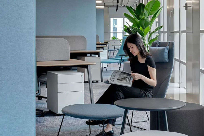 入戶的觀感尤為純粹,由一面數(shù)碼互動墻將視覺由電梯廳引入內(nèi)部,極致的暗調(diào)勾勒出明快的線性淺灰色logo墻并有向上延伸之感,自發(fā)光logo猶如秘境中的湛藍熒光寶石恬靜而自信的展現(xiàn)自我,黑色Bolon毯紋理隨著視覺的變化不斷變幻伴隨空間動線,將訪客緩緩引入內(nèi)場直達休憩區(qū),猶如數(shù)字科技傳動向前并引領未來。此處形式多樣的家具配合綠樹盈動,構(gòu)造了訪客和員工之間交融和平衡的靈動空間。