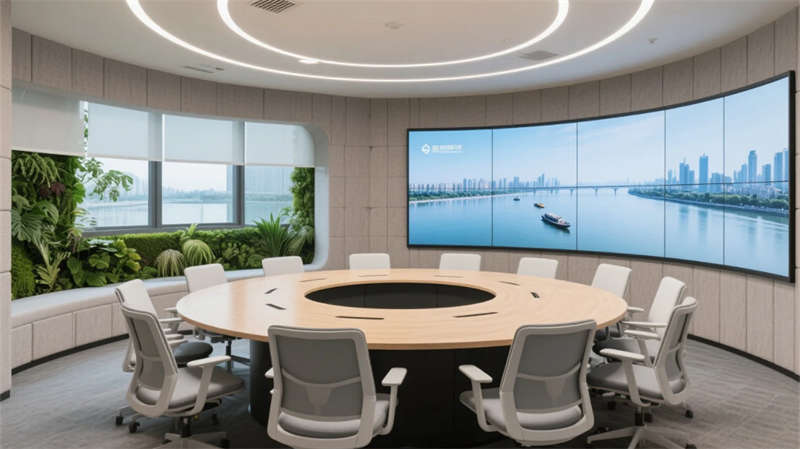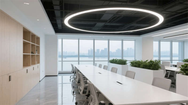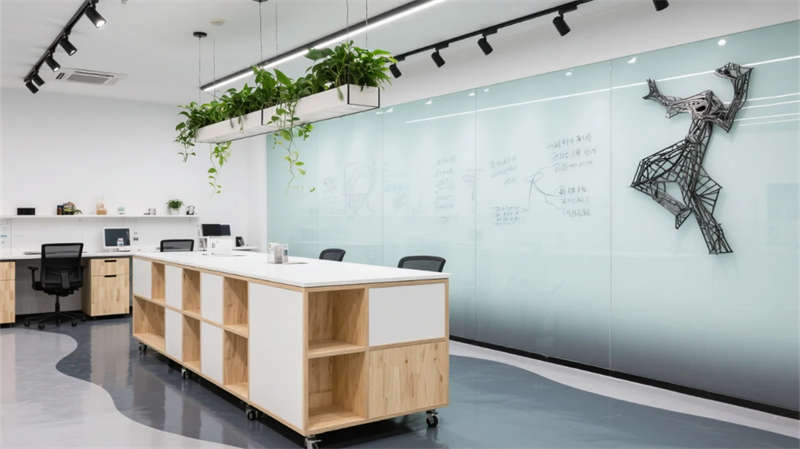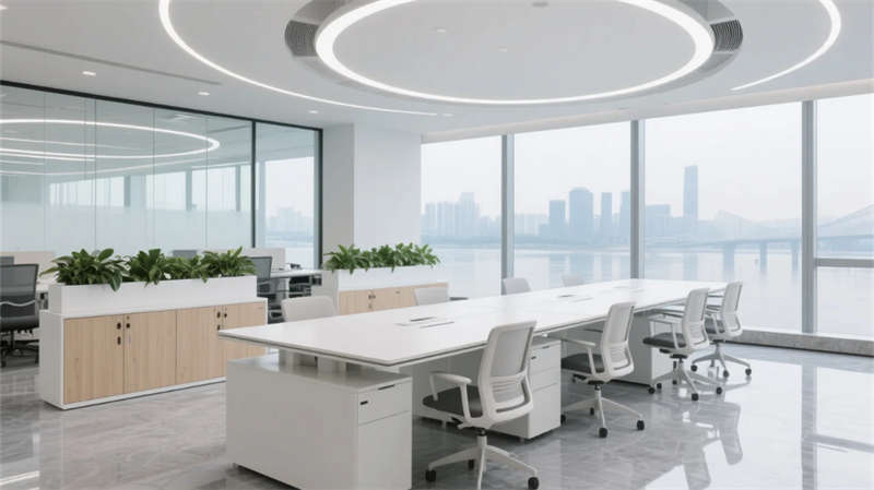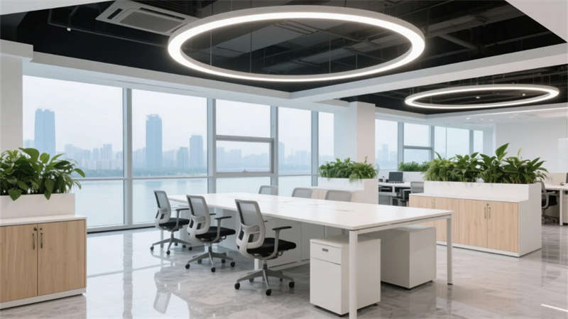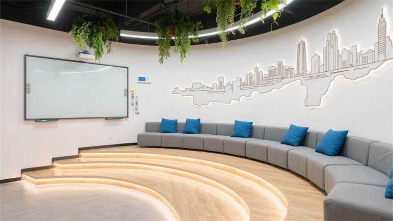 開放辦公區(qū)以模塊化綠植隔斷柔化邊界,智能會(huì)議艙曲面屏動(dòng)態(tài)呈現(xiàn)江岸線,賦予協(xié)作以在地詩意。創(chuàng)意實(shí)驗(yàn)室的可書寫玻璃墻與磁吸家具激發(fā)即興創(chuàng)造,而階梯沙龍區(qū)弧形燈帶如江水蜿蜒,引導(dǎo)思想交匯。