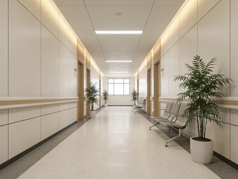 門診大廳以淺木色與純凈白為基調(diào),挑高空間搭配懸浮式吊頂,自然光透過大面積落地窗灑入,與室內(nèi)精心布置的景觀綠植呼應(yīng),消解患者的緊張感。分診臺(tái)采用弧形設(shè)計(jì),圓角處理的臺(tái)面與溫潤的材質(zhì)傳遞出細(xì)膩關(guān)懷。