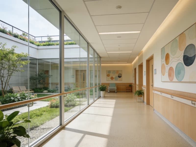 康復(fù)區(qū)與屋頂花園相連,通透的玻璃隔斷讓自然光線充分進(jìn)入,地面采用防滑且富有彈性的材質(zhì),墻面懸掛療愈系畫作,患者可在此享受陽光與綠植的雙重滋養(yǎng)。