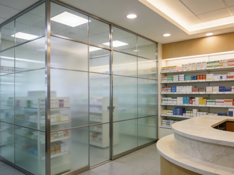 藥房采用半通透的玻璃隔斷,內(nèi)部陳設(shè)整齊有序,取藥臺(tái)高度貼合人體工學(xué),溫和的燈光讓藥品陳列既清晰又不刺眼。