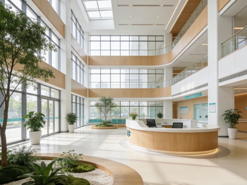 本設(shè)計(jì)以“療愈共生”為核心理念,為合肥這座綜合醫(yī)院構(gòu)建兼具功能性與溫度的空間。外觀采用柔和的曲線與淺米色石材,搭配錯(cuò)落的玻璃開窗,打破傳統(tǒng)醫(yī)療建筑的刻板印象,墻面局部嵌入垂直綠植帶,讓自然氣息從建筑表皮便開始滲透。