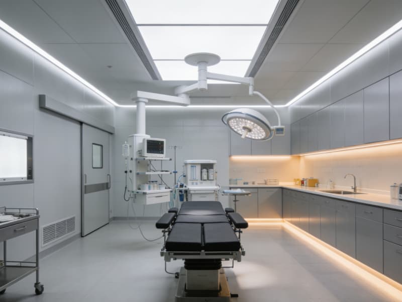手術(shù)室區(qū)域以潔凈的灰白色為主,搭配暗藏式燈帶與防菌墻面,動(dòng)線設(shè)計(jì)清晰流暢,確保高效運(yùn)作的同時(shí),通過局部的暖光點(diǎn)綴弱化冰冷感。