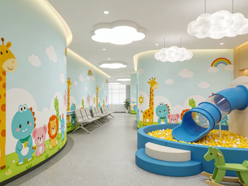 兒科專區(qū)則融入柔和的弧線與低飽和的馬卡龍色調(diào),墻面繪制童趣圖案,候診區(qū)設(shè)置小型游樂角,用輕松氛圍緩解孩童對就醫(yī)的恐懼。整個(gè)空間在保障醫(yī)療功能的同時(shí),讓自然與人文關(guān)懷貫穿始終。