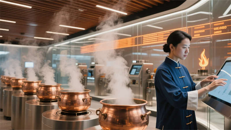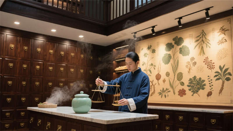 露天庭院白石鋪就太極紋路,素衣身影在紫竹霧靄間起勢推掌,漏窗剪出晨練動(dòng)態(tài)。名醫(yī)診室紅木案上脈枕微溫,博古架藥材標(biāo)本與滿墻醫(yī)典沉淀千年智慧。智慧煎藥中心的銅鍋陣列于胡桃木頂下吞吐蒸汽,光影交織傳統(tǒng)與現(xiàn)代。