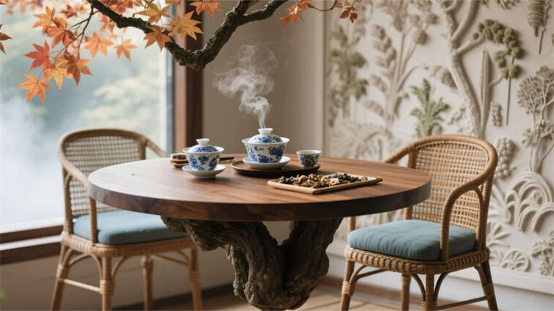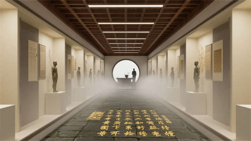 針灸室格柵隔斷透出晨光竹影,經(jīng)絡(luò)圖前銀針泛著柔光;文化長廊地面流動(dòng)篆書金句,引領(lǐng)視線穿透月洞門望向煎藥銅鍋升騰的薄霧。茶療區(qū)古茶樹畔,藥汽氤氳于青花茶盞,百草浮雕墻下藤椅邀人小憩。